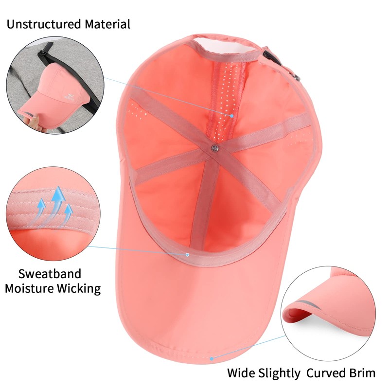 - Adjustable Head Circumference: the head circumference of the running cap is 21.3 "- 23.6", the brim width is 3.35 ", and the cap depth is 5.12". Suitable for most people. The back of the workout hats for women has an adjustable metal buckle, and the extra hat strap can be hidden under the sweat-absorbing cotton strip.