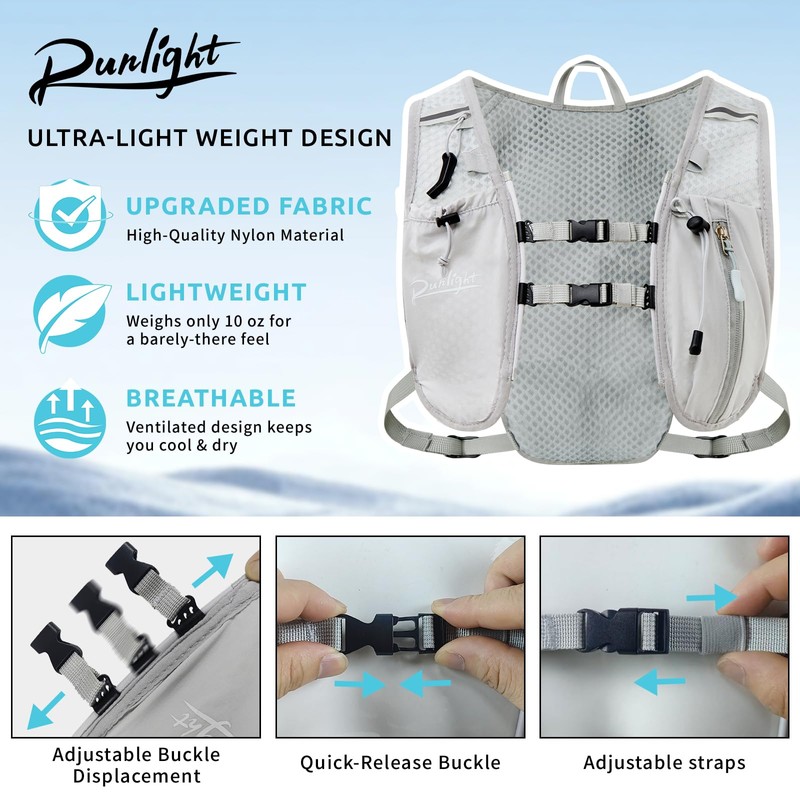 - BREATHABLE and FEATHERLIGHT:Runlight hydration vest is made from breathable, lightweight neoprene with triple-sized ventilation holes for enhanced air circulation and moisture-wicking.The ventilated mesh cover keeps your back cool by maintaining air circulation, preventing discomfort due to accumulated heat, and providing excellent air circulation and breathability.