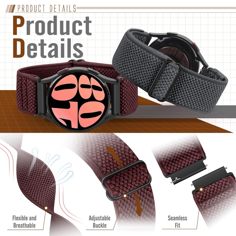 - 【Adjustable Size & Elasticity】The elastic nylon band with strong elastic, keep your watch snugly to your wrist without rubbing on your skin. Stylish loop buckles design allows you to adjust the size of the loop as you wish. Suitable for wrist size 5.7’’ - 9.8’’(145mm-250mm).
