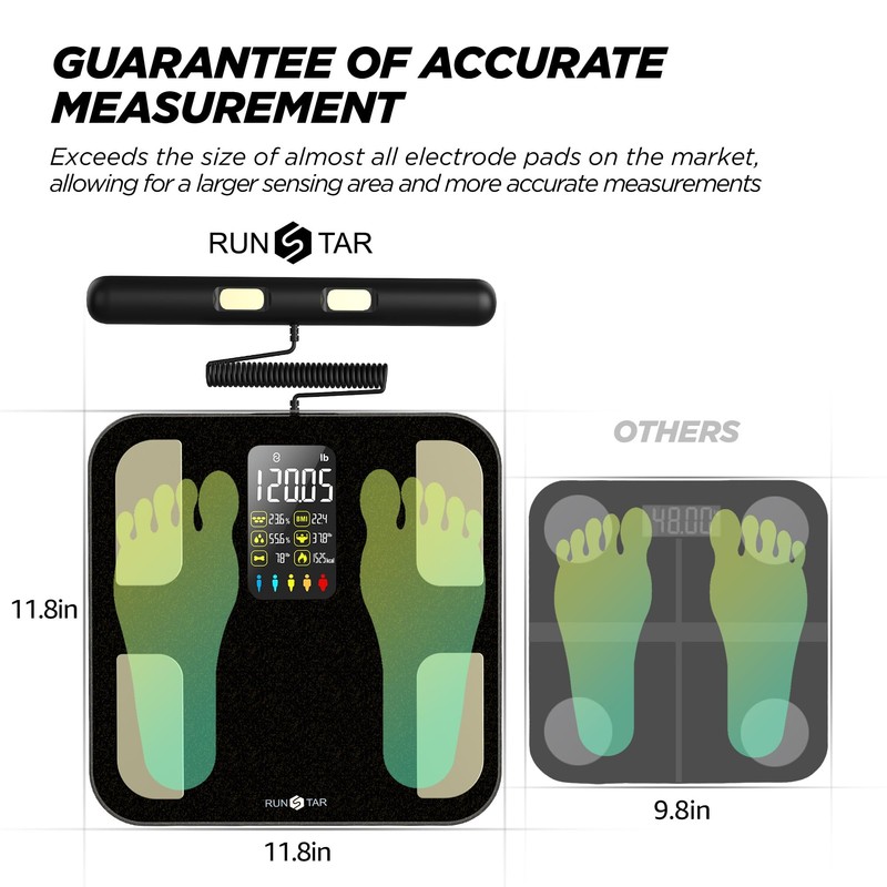 • 20 Essential Measurements: Runstar smart scale shows not only weight but also BMI, body fat, subcutaneous fat, body water, protein, BMR, bone mass, body age etc., by electrical Bio-Impedance Measurement Technology.
