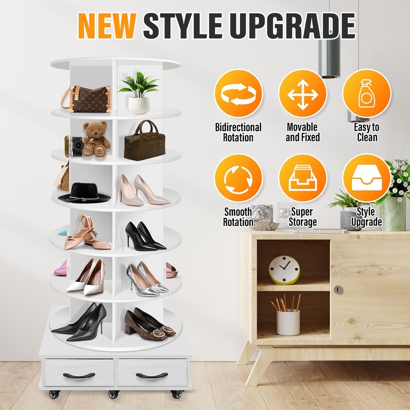 - 【6-Tier Shoe Display Holder】--- 6-Tier Rotating Shoe Rack offers a remarkable space-saving solution. Large capacity shoe rack and 2 storage drawers, put on any pair of your favorite shoes. You can also put your handbags, hats or any other accessories on this shoe organizer.