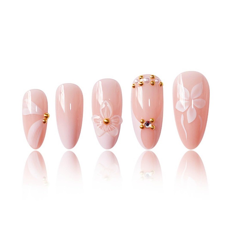 RUOKEXIN Almond Press on Nails Medium Fake Nails White Ombre False Nails with 3D Flower Designs Sparkly Artificial Nails Acrylic Glue on Nails Press ons Cute Stick on Nails for Women 24Pcs