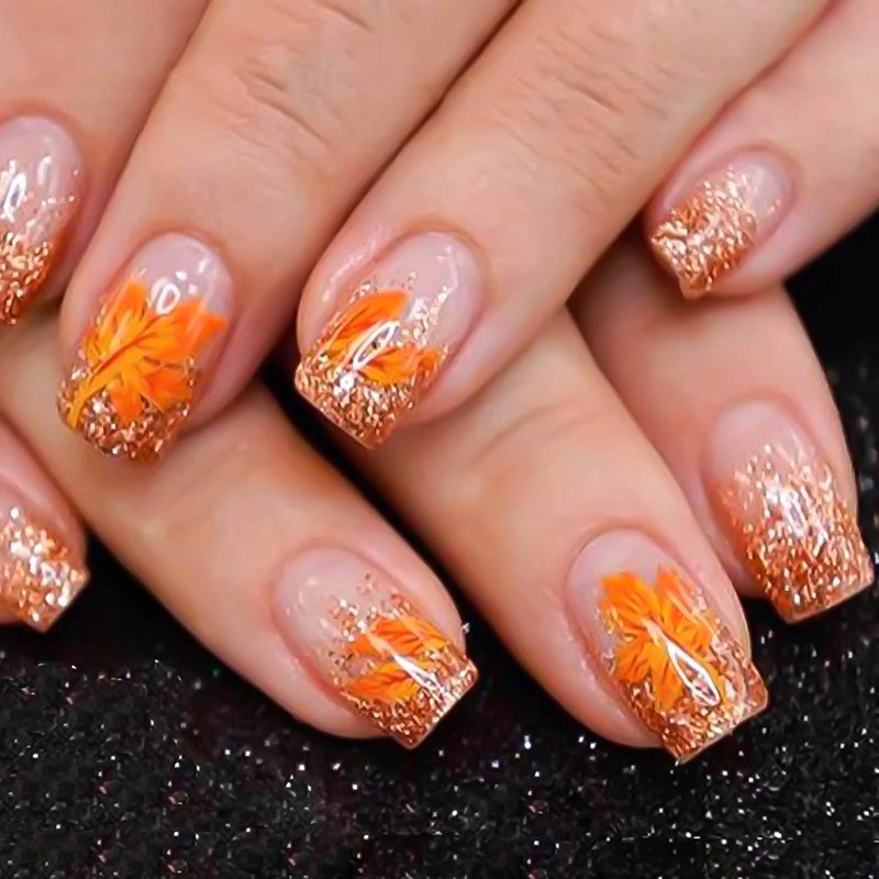 RUOKEXIN Fall Press on Nails Short Square False Nails Orange Glitter Fake Nails with Maple Leaf Designs Glossy Sparkly Thanksgiving Artificial Nails Short Cute Glue on Nails for Women 24Pcs