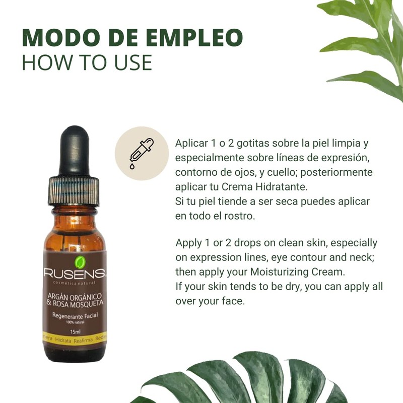 Rusens - Aceite Regenerante y Antiedad de Argán Orgánico y Rosa mosqueta 100% natural, Disminuye Líneas de Expresión y Regenera la Piel