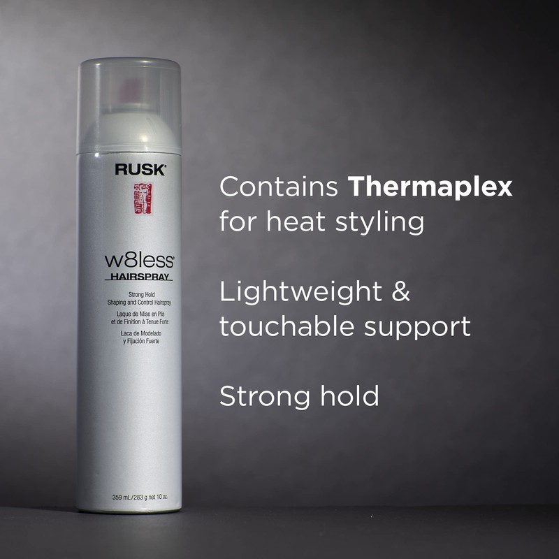 - Rusk w8less strong hold shaping and control hair spray is a versatile design tool, which provides texture, luster and long lasting softness
