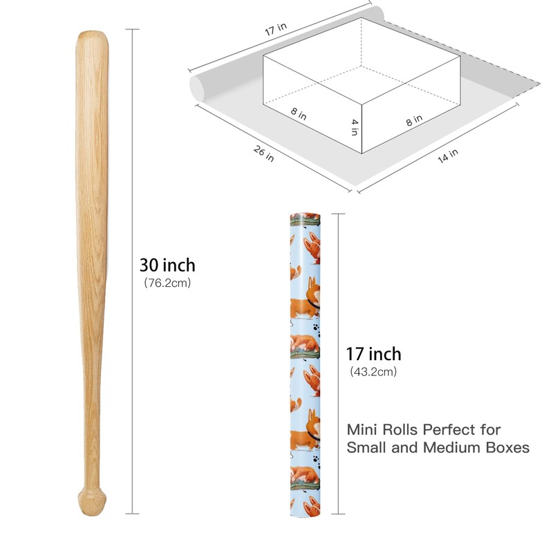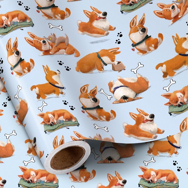 RUSPEPA Corgi Dog Wrapping Paper Roll for Kids Adults, Mini Roll, Cute Cartoon Corgis with Bone and Paw Prints Design, Funny Gift Wrap for Dog Lovers, Birthday, Pet-Themed Party, 17 Inches x 16.4 Feet