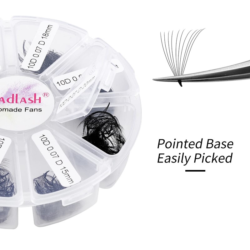 - Volume eyelashes details: Fadlash lashes 10D. Thickness: 0.07 Curl: D. Mixing length 15-20 mm. Our loose eyelash fans come in packages with 1000 compartments (+-2%), 8.3 times as much as other 12-row pre-made eyelash fans in trays.