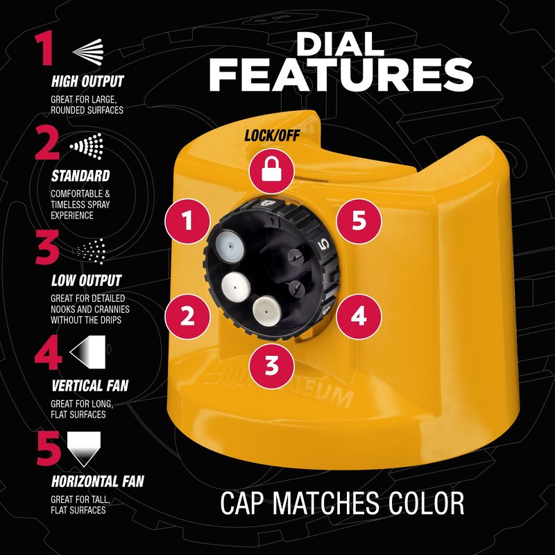 - Custom Spray 5-in-1 dial offers five spray paint patterns for ultimate control and superior results