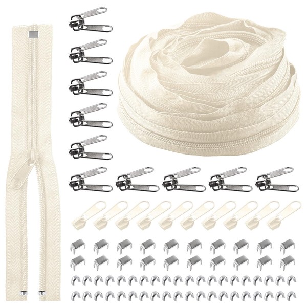 - What You Get: You'll receive 10 yards of #5 beige nylon coil zipper rolls in continuous. The nylon coil zipper package comes with zipper sliders, bottom stop, and top stop, including 10pcs beige single zipper sliders and 10pcs silver double zipper sliders, 20pcs bottom zipper stops and 40pcs top zipper stops. Sufficient quantities can meet your various daily craft sewing needs for different processes.