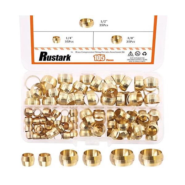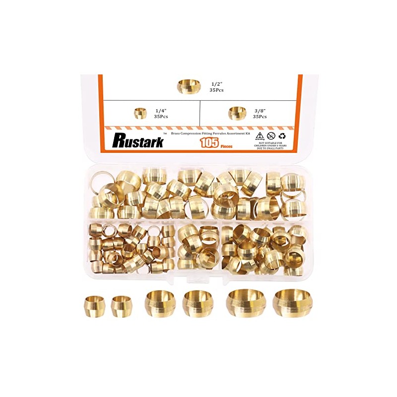 Rustark 105Pcs 1/4” 3/8” 1/2” Brass Compression Fitting Sleeves Ferrules Assortment Kit Tube Hose Ferrule Compression Fitting Set