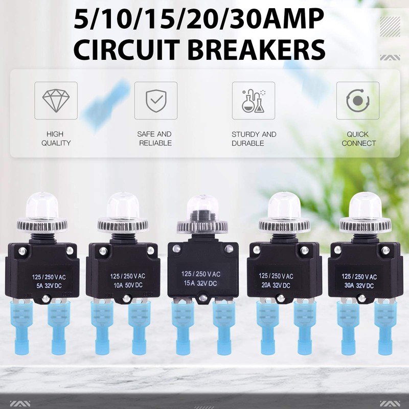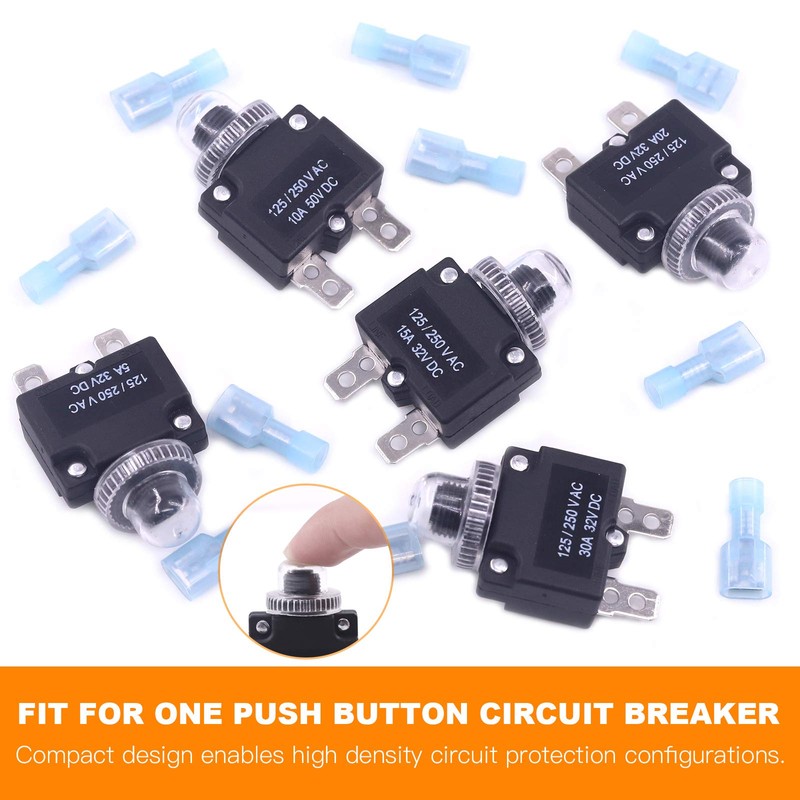 • 【What you Get】The DC Push Button Reset Circuit Breaker set contains 10 pcs 20 amp dc circuit breaker( each push circuit breaker with cover), 20 pcs Quick Connect Terminals, totally 30 pcs.