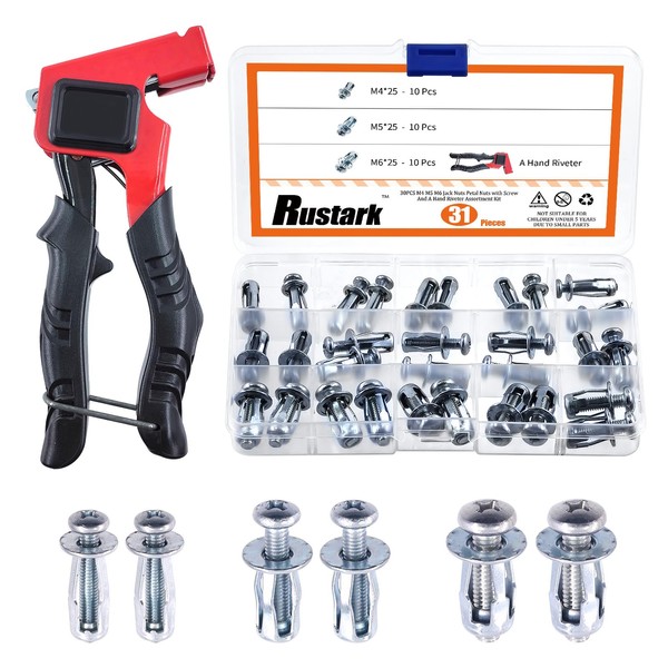 Rustark 30Pcs M4 M5 M6 Jack Nuts Petal Nuts Assortment Kit with Metal Setting Tool, Threaded Insert Petal Nuts Expansion Jack Nuts Threaded Insert Nuts Rivnut Blind for Hollow Wall Iron Skin