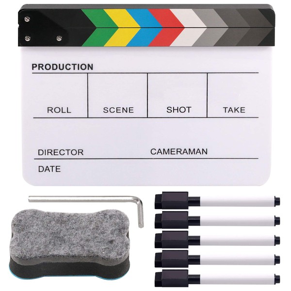 - 🎬【What you Get】The professional film movies clapboard set contains 1 pcs action cut board, 1 pcs M3 hex wrench, 5 pcs erasable pens and 1 pcs magnetic, totally 8 pcs. The complete and professorial kit will offer you amazing experience.