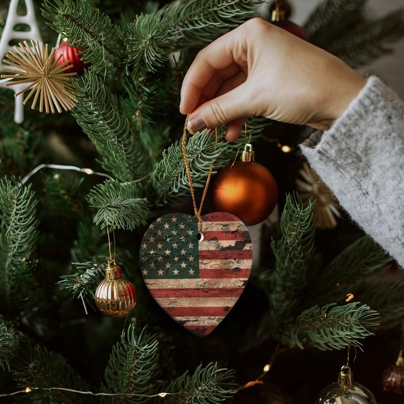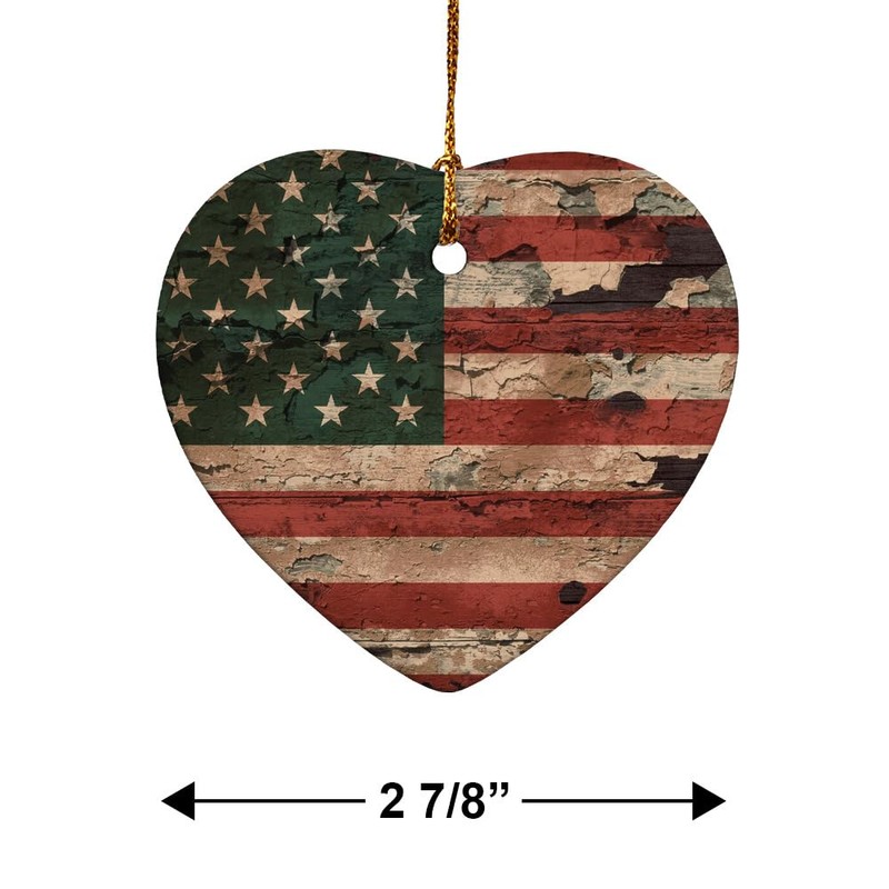 Rustic American USA Flag Distressed Heart-Shaped Porcelain Holiday Christmas Tree Ornament - 2.8"