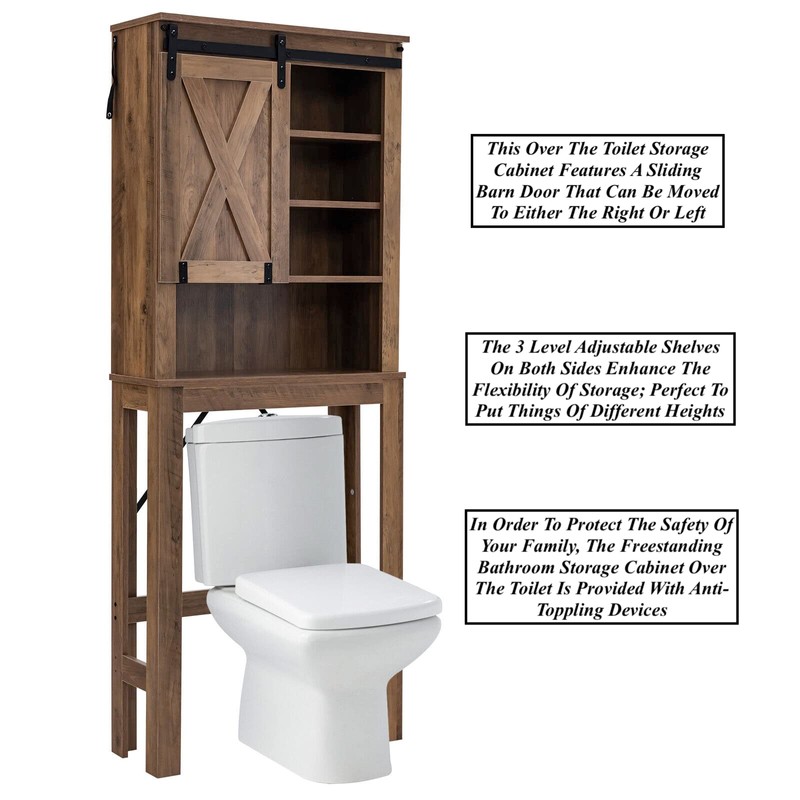 Rustic Brown Over The Toilet Bathroom Storage Cabinet with Sliding Barn Door 3 Position Adjustable Shelves Safe with Anti-Toppling Device Ample Storage Space for Storing Toiletries Cosmetics