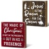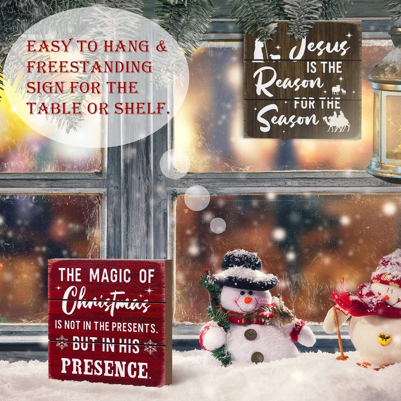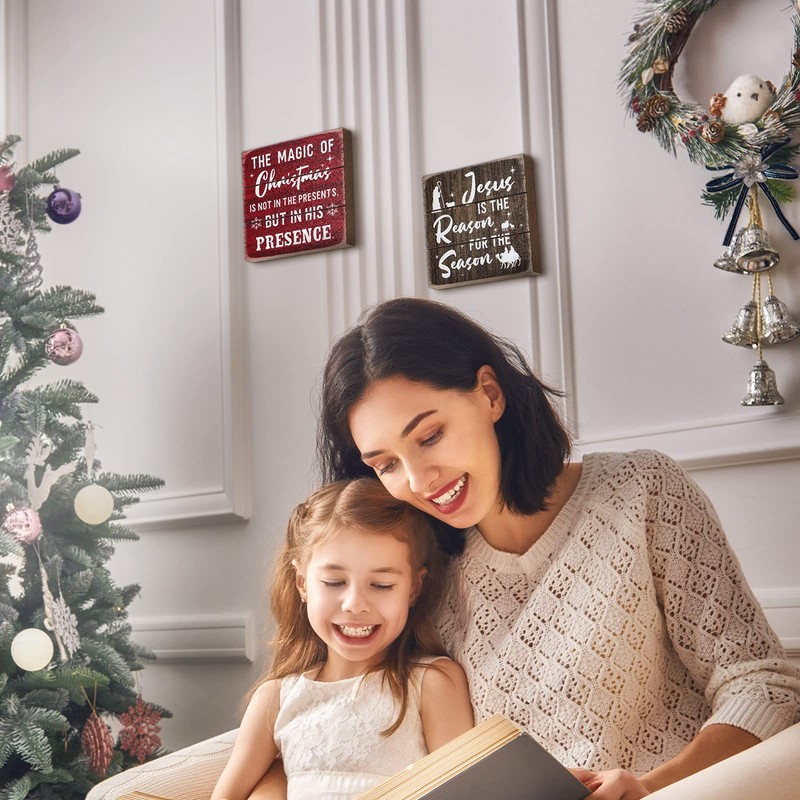 - Words on the Christmas hanging plaque: [the magic of Christmas is not in the presents, but in his presence] and another is [Jesus is The Reason for The Season], primitive decor sign will make everyone smile at its delightful saying