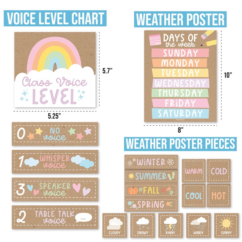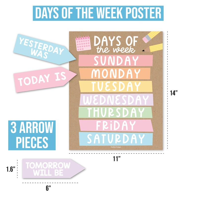 - Get Kids Excited About Their Day; You'll receive 98 individual calendar pieces, 1 - 8x10 weather chart, and 1 - 11x14 days of the week poster; Inspire a love for learning with this boho kraft school calendar for classroom elementary/teacher calendar for classroom