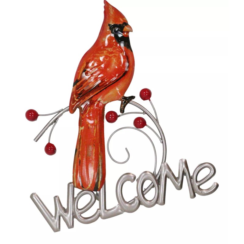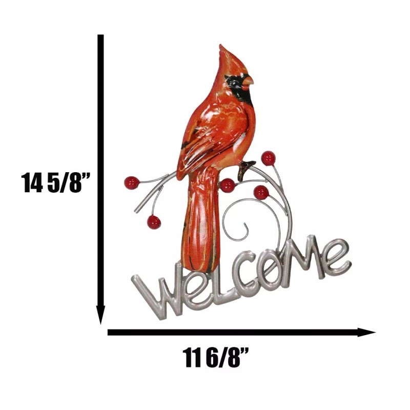 • This incredible cardinal wall welcome sign makes a charming decorative statement for any deck, patio, porch, veranda, backyard, lawn or garden, or a wonderful gift for the holidays, a new neighbor, or the fall holidays. Featuring a beautiful color enhanced red cardinal bird perching on a curved silver branch with red buds at the ends. A WELCOME word art sign is set at the base of the wall decor to greet your neighbors, friends and family as they enter your home!