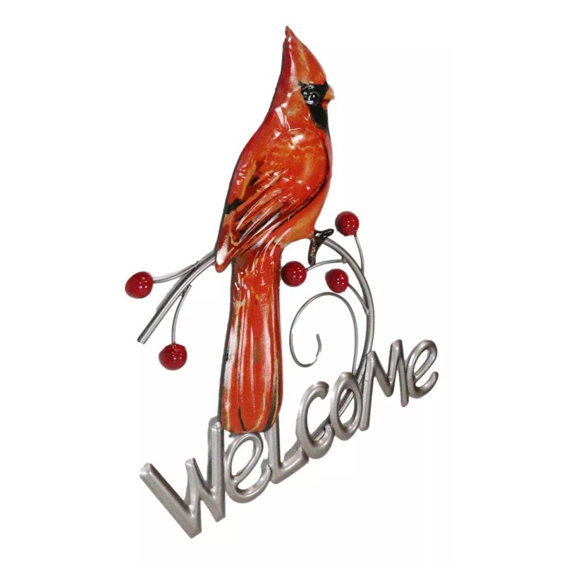 • This Cardinal Perching On Welcome Sign Wall Plaque Cutout is made of aluminum, hand painted and polished individually. Our artisans finished the sculpture with an acrylic 'wet' color enhanced finish.