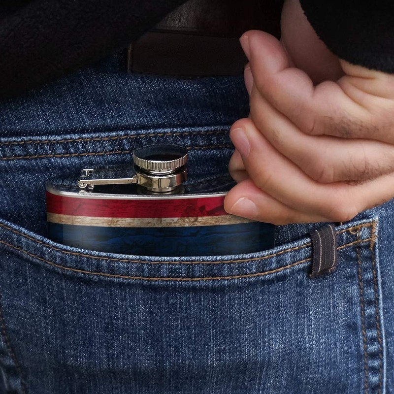 - DURABLE CONSTRUCTION: Made of stainless steel and wrapped in a laminated graphic, our pocket-ready flask holds up to 5 ounce of your favorite beverage. The screw-on cap ensures leak-free performance.