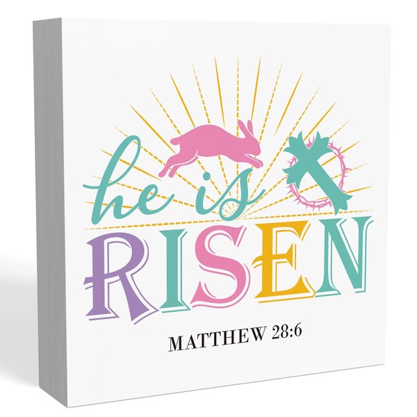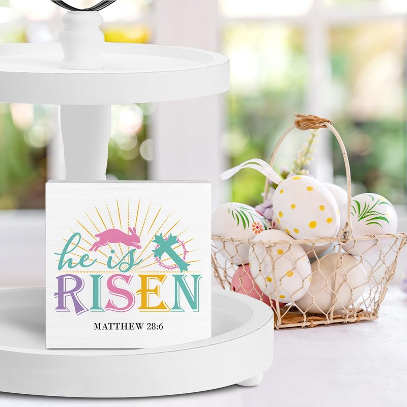 Rustic Easter Office Desk Decor - Cute Bunny He Is Risen Easter Wood Sign - Farmhouse Easter Tiered Tray Decoration - Cubicle Shelf Bathroom Decor 5 x 5 in