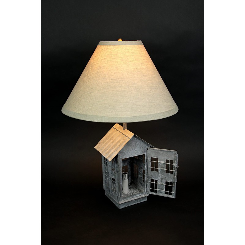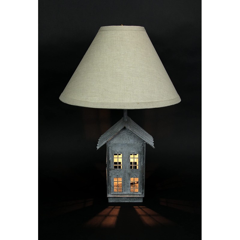 Rustic Galvanized Grey House-Shaped Double Light Table Lamp and Accent Light - Beige Fabric Shade - Mid Century Modern Farmhouse Decor - 22 Inches High