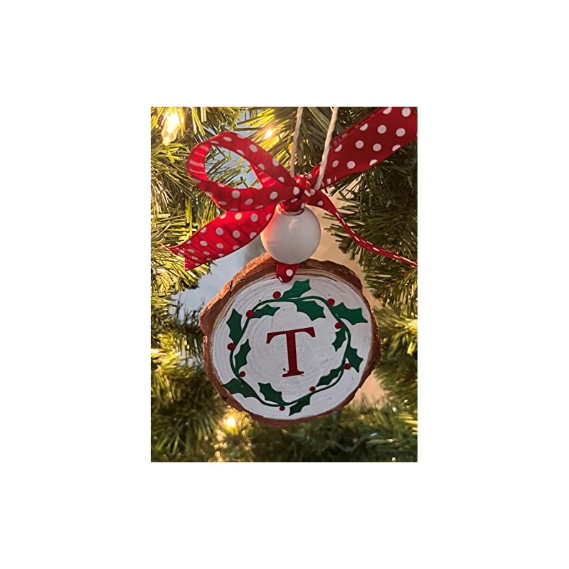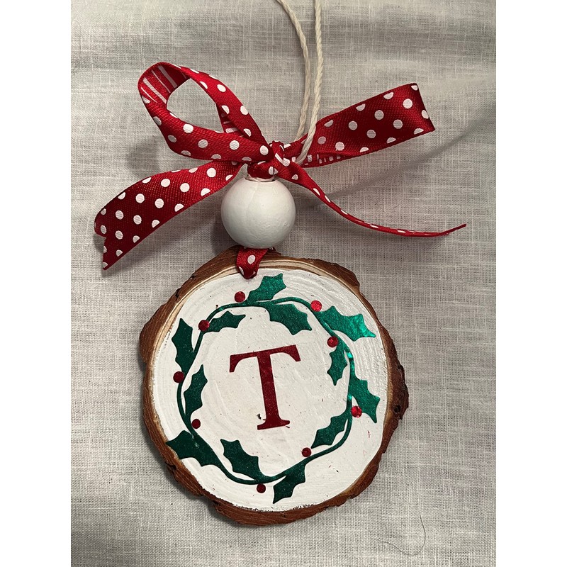Rustic Initial Monogram"T" Holly Wood Slice Ornament