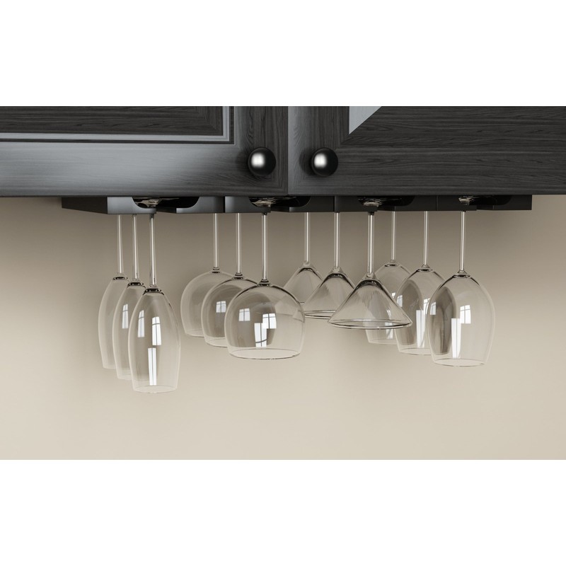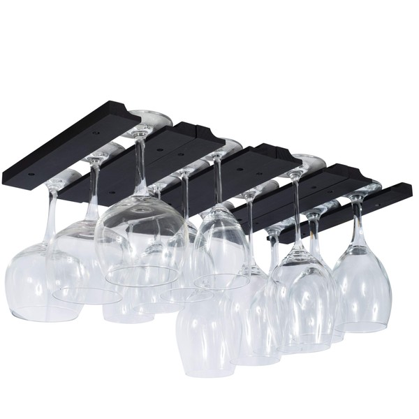**Convenient and Chic Alternative to Storing and Organizing Your Precious Stemware…** **Minimalist Design:** The simplistic yet chic design is practical enough to help you get rid of your bulky storage solution to make better use of your valuable kitchen space. You can easily tidy up your countertop and cabinets, or you can mount this rack in your credenza, hutch, buffet, sideboard or other bar storage cabinet to keep your stemware conveniently within reach of your dining table. **No Fuss and Frustration:** With your kitchen cabinets tidy and your heightened glasses within reach you can make your life a lot easier. Spend some time to unwind after a long, tiring and stressful day at work, but you can only do this by keeping your wine glasses organized. Don’t get frustrated furthermore looking for a glass to get you through the night. **Fragile Alert at Your Fingertips:** You don’t have to go spelunking for glasses inside the depths of your cabinets. When your bulky glasses are hard to reach things can get frustrating and your fragile stemware collection can get chipped, scratched or it can even break. **The Hanging Wine Glass Storage Rack Will Help You To:** Organize and de- clutter your kitchen and display your stemware in your dining room to serve your guests more conveniently. **FEATURES:** **Material:** Hardwood **Color:** Black **Each Rail’s Dimensions:** 12" x 1.75" x 0.75" **See What Will Arrive with Your Order Today:** Under Cabinet 4-Sectional Adjustable Stemware Storage Rack with Mounting Hardware