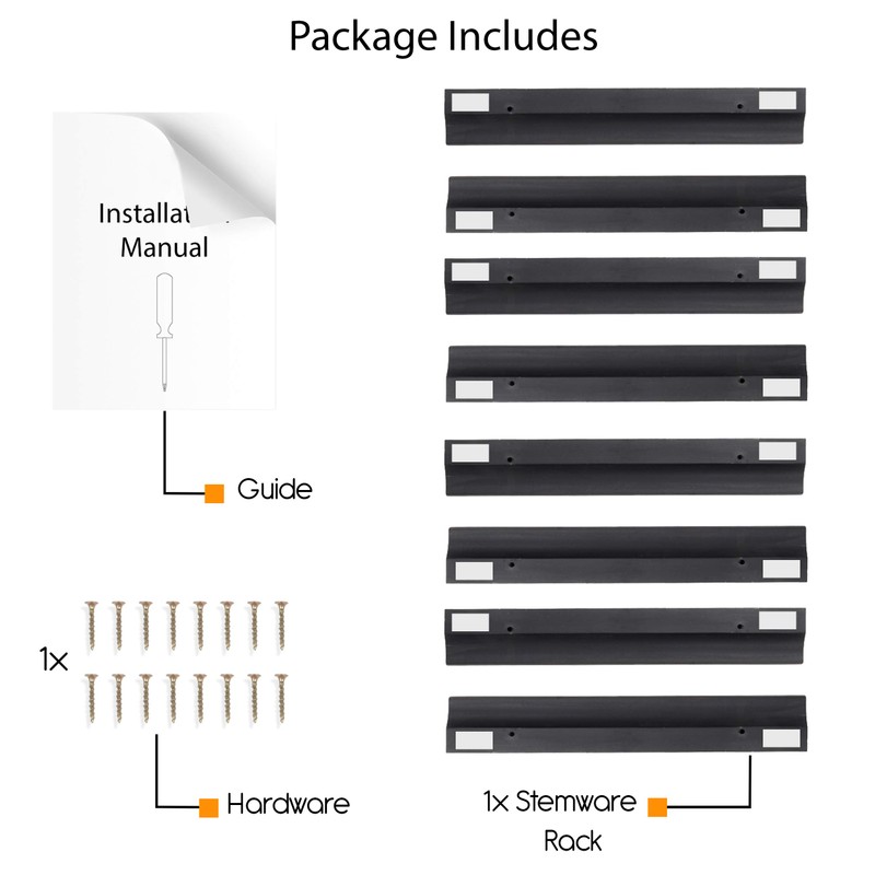 • No Fuss Assembly: Improved design with double side stickers make installation easier first in the market .This under cabinet wine glass holder consists of 8 12-inch long rails with 4 adjustable slots and with the mounting screws and anchors included in the packaging you can save yourself a trip to the hardware store. The assembly will be breeze, you don’t have to hire a professional to install this organizer for you.Please check installation manual in the listing details