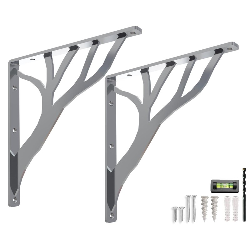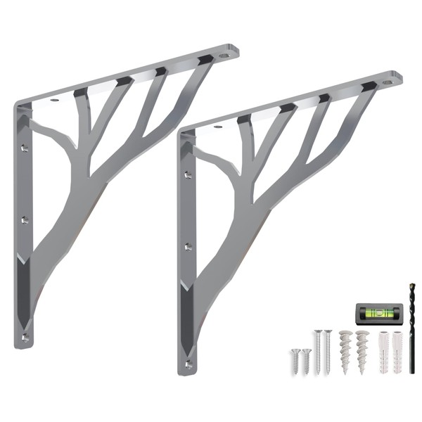 Rustic Tree Chrome Heavy Duty Shelf Brackets 12 inch by Balin Designs, Silver Decorative L Brackets, Iron Metal Floating Shelf Bracket, Wall Mount Shelving Bracket, Included Hardware, Set of 2