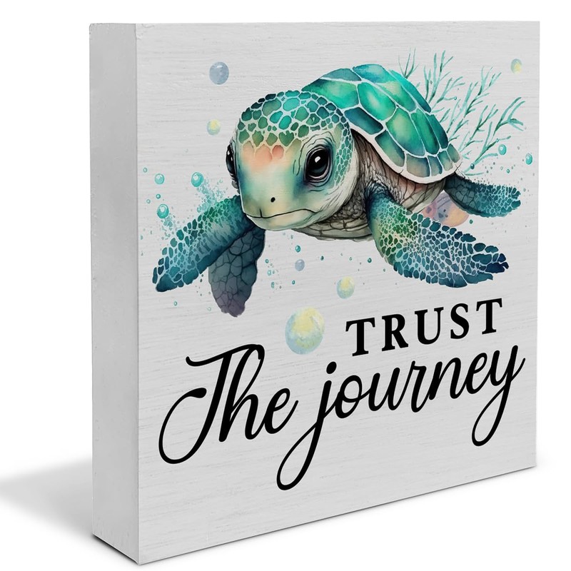 Rustic Trust the Journey Beach Wooden Box Sign Desk Decor, Sea Turtle Wood Block Sign Home Beach House Tabletop Shelf Desk Decoration, 5 X 5 Inches