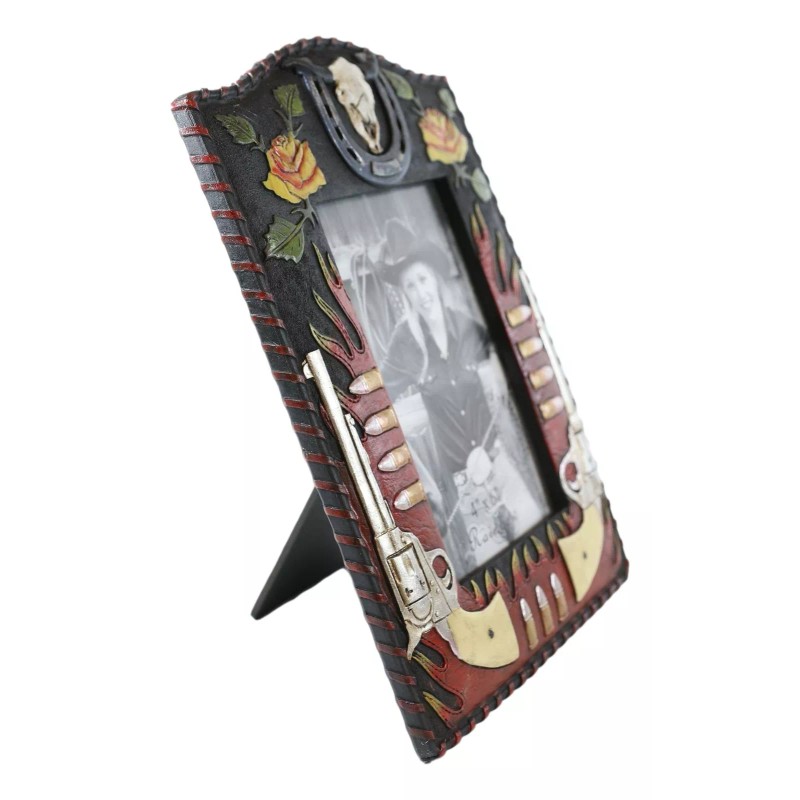 • Do you know a Country Western or Cowboy Theme Lover out there that needs a beautiful Picture Frame. This is the perfect Western Decorations great gift for a birthday, Christmas, Veterans Day, or just because. A great conversation piece and an awesome addition to any room. Featuring two revolver pistol guns, cow skull, horseshoe, bullets and roses this picture frame will hold your 4"by6" photos.
