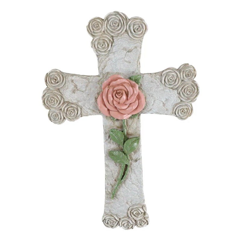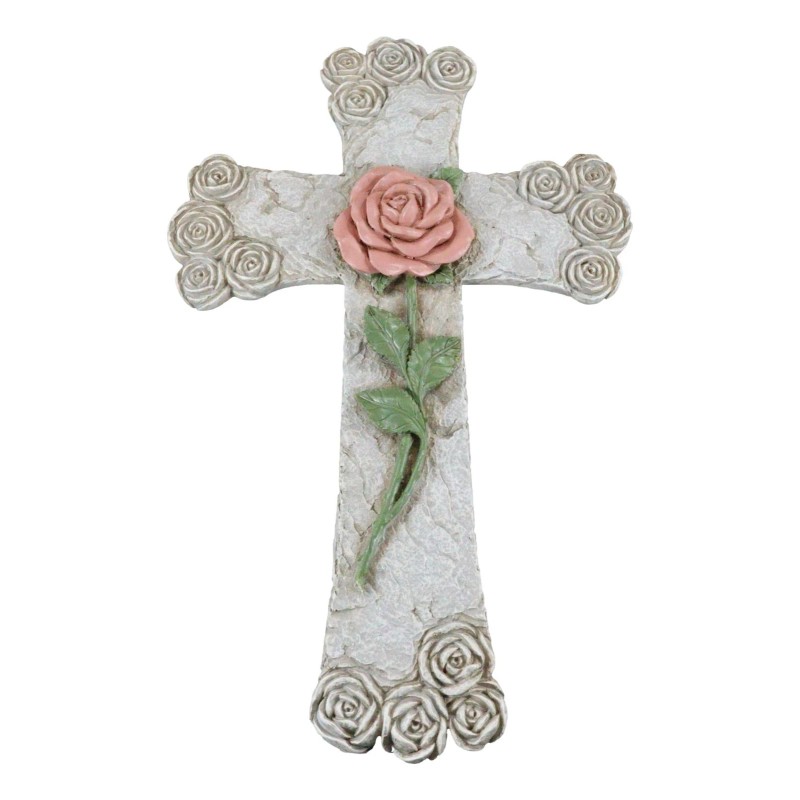 • This hanging wall cross is the perfect addition to any home of faith. Its unique style is sure to become a welcome staple of any room. Consider this item as a gift for any of your faithful friends or family. Designed to look like textured stone, the cross has a pretty pink rose stalk in the middle and on every end of the panels are tooled rose blossoms.