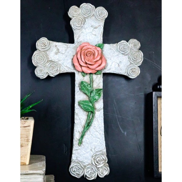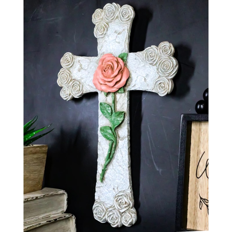 • This Faux Stone Pink Rose Wall Cross measures 12.5" High, 9" Wide and 1" Thick approximately. It weighs about 15 ounces.