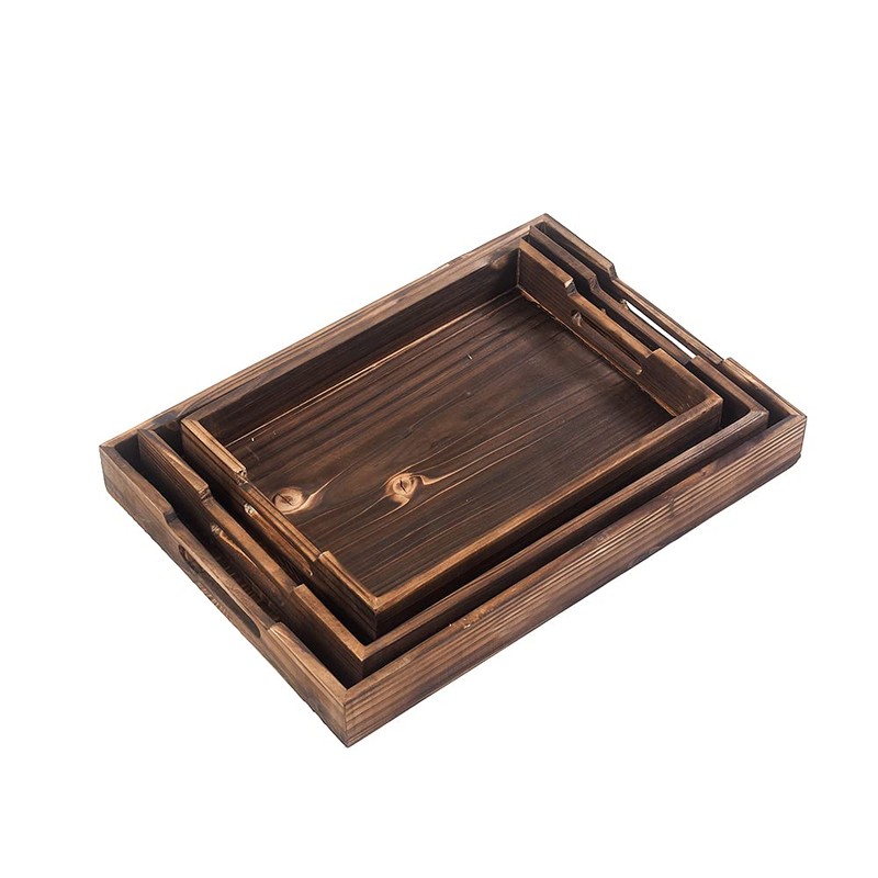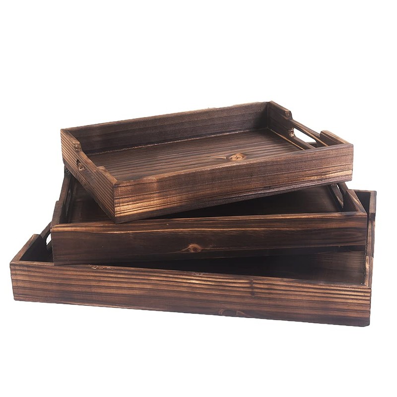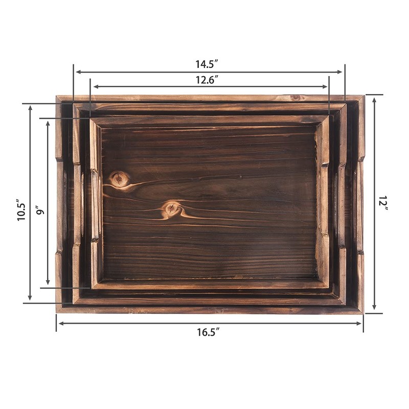 - Must Try Nesting Tray Set : Rustic wooden rectangular serving nesting tray set with handles very beautiful and very spacious; Light weighted and easy to handle. Good finishing. Adds to the decor of any space. Set of 3 large sized 17 inch, medium sized 15 inch rectangular and small sized 12 inch square shape.
