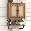 - 【✨Modern Boho Wall Cabinet - Transform Your Space】 - The wood bathroom wall storage cabinet frame with woodgrain rustic oak finish, arched rattan doors, and handcrafted metal knobs blends organic textures with modern style.The X-shaped metal base is chic and ensures stability while complementing the bohemian/minimalist/cottage décor of your bathroom, kitchen or living room. A blend of bohemian nature and metallic modernity, it's both storage and art deco, perfect for the bathroom/kitchen/living room/laundry room to revitalize your space!