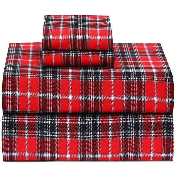 RUVANTI 100% Cotton 4 Pcs Flannel Sheets Queen Size, Deep Pocket, Warm, Super Soft, Breathable, Moisture Wicking Queen Sheets, Bed Sheets Include Flat, Fitted Sheet, 2 Pillowcase - Red Plaid