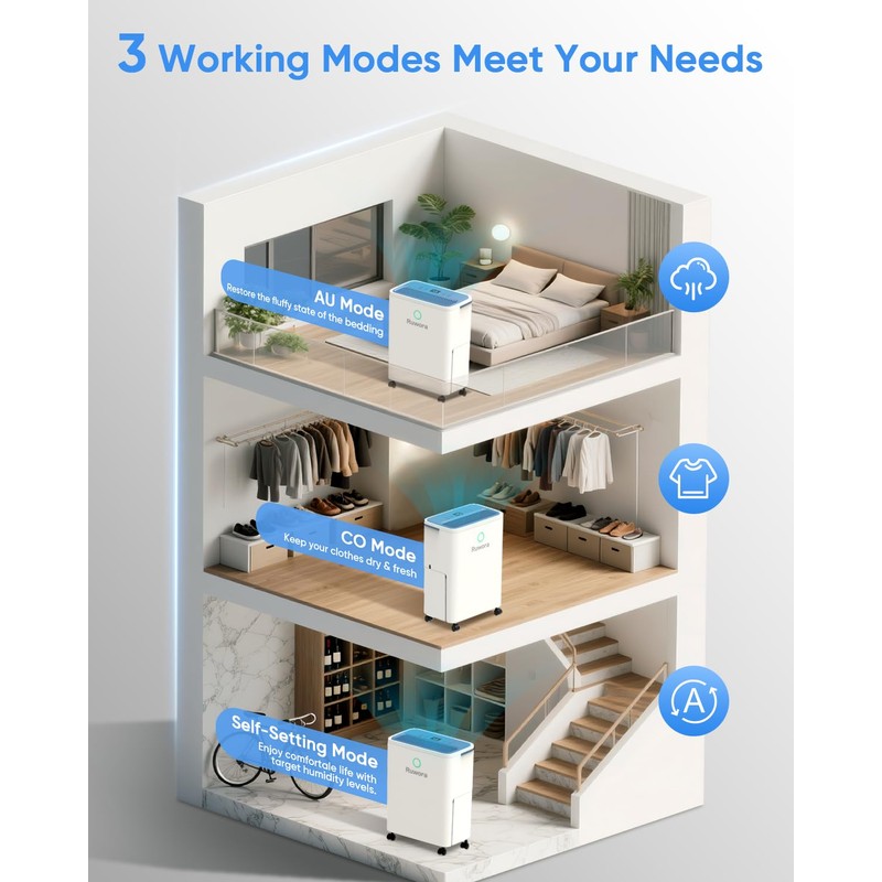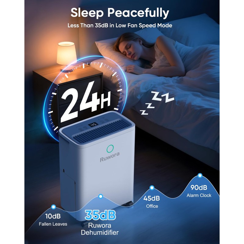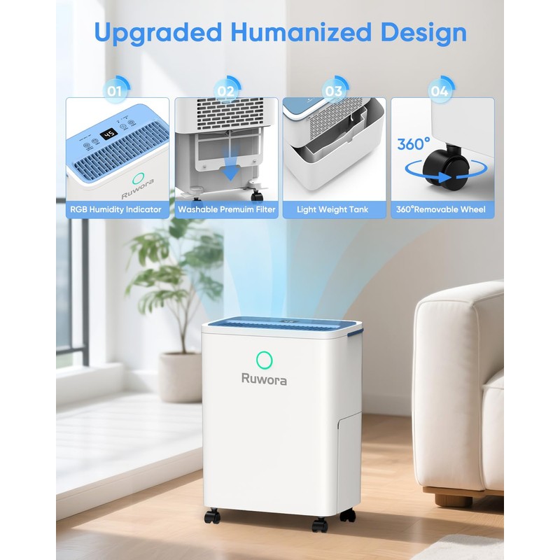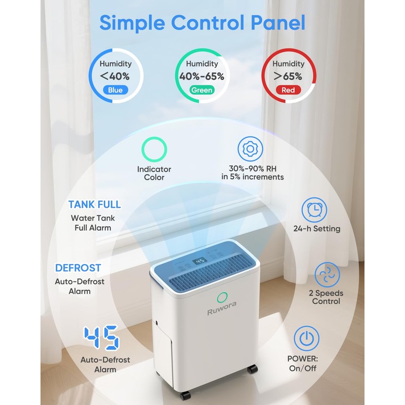 - 【Intelligent Control & Visualized Humidity】:Our RUWORA dehumidifier is equipped with a touch-sensitive smart screen for easier operation without worrying about the keys being damaged. Press the "SETTING" button to display actual humidity or adjust humidity (30%-90% RH in 5% increments), and set the ideal value. It will automatically stop working when the specified humidity is reached.