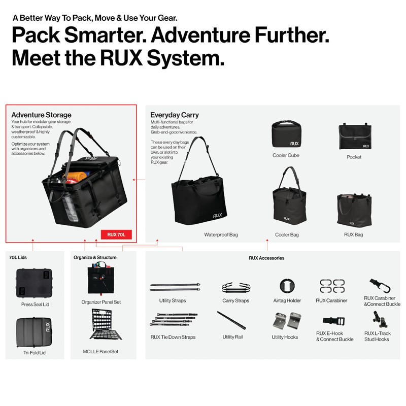 • Secure & Flexible Carry Options – Roll-top closure protects from water, snow, dust, and UV while keeping everything locked in. Multiple lash points let you attach your cooler bag small to your vehicle, backpack, kayak, or gear rig, or pair it with a RUX shoulder strap for hands-free carry. No more loose gear—RUX keeps everything in one place, so you can load up quickly and hit the trails faster.