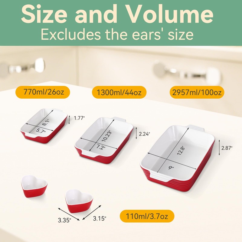 • Versatile 5-Piece Set--This casserole dishes includes 3 baking pans in different sizes, Large: 12.8*9*2.87inch, Medium: 10.23*7.2*2.24inch, Small: 8.1*5.7*1.77inch.(excludes the ears' size) and 2 heart-shaped ramekins. High-quality ceramic casserole dish set, made of safe materials, these are suitable for making spaghetti, lasagna, bread, casseroles, chicken, roasting, beef, potatoes, vegetables, storing food and more. Small ramekins are designed for souffle, crème brûlée, custards, desserts and more.