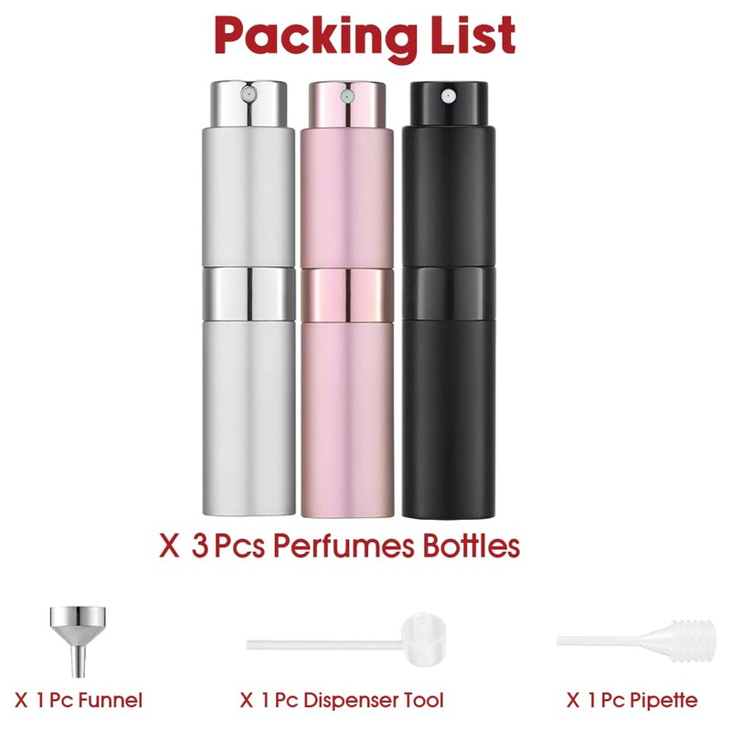- FEATURE: Pack of 3, 8ml travel perfume bottle refillable are used to dispense perfume, cologne, and cosmetics when traveling or going out. The travel cologne sprayer is refillable and portable, with no drips or leaks. The travel spray bottle Package includes Pink, Black and Silver Perfume bottle.