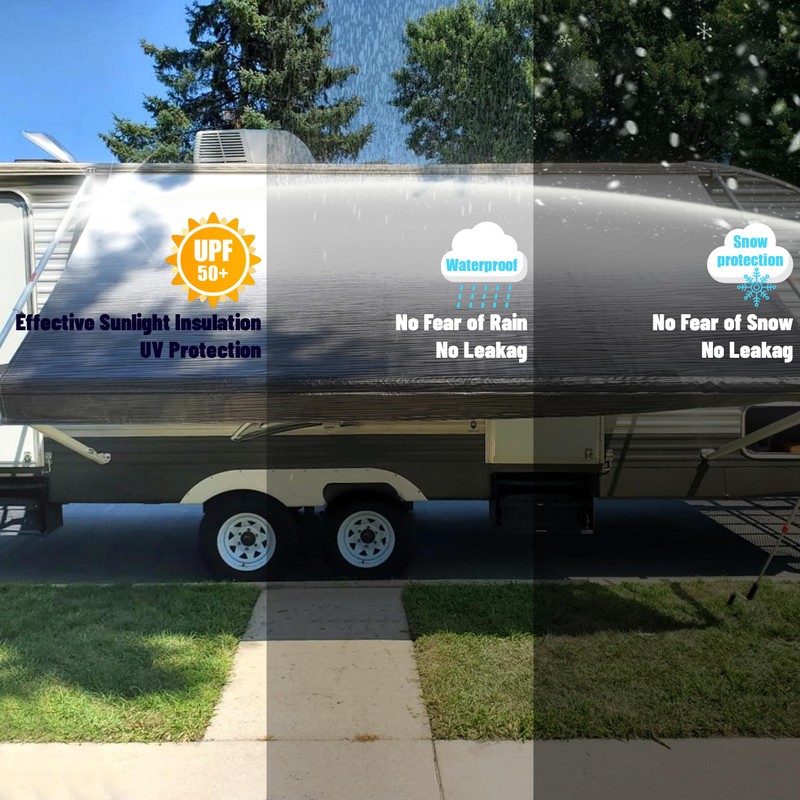 • Super Easy Installation Process:No special tools are required,just simply slide the three sewn-in polycords on the awning fabric into their respective RV awing guide rail, and the RV awning fabric will be securely in place.