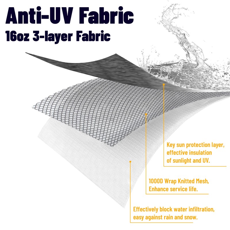 • Exquisite professional technology:We use webbing and hot pressing process to reinforce the stress point of each RV awning fabric to make our product crack and tear resistant.The 1000D Integrated Mesh enables it to withstand harsh conditions, even at -20°F, without tearing.
