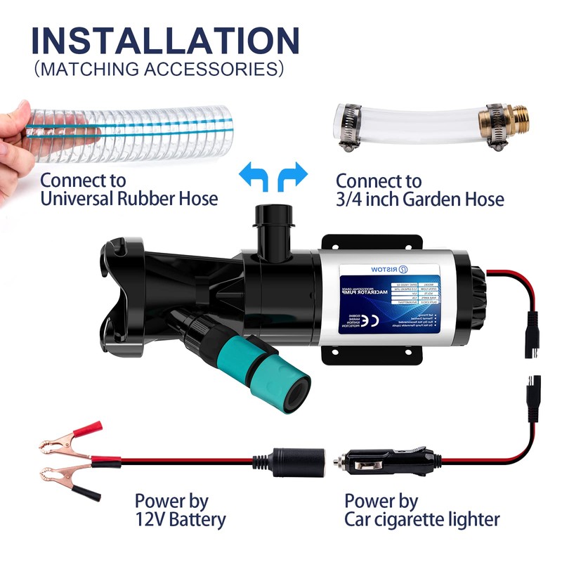 RISTOW RV Macerator Pump 12V, 12GPM RV Waste Water Pump Self-Priming Sewer Pump with Garden Hose Discharge Port, Quick Release Sewage Pump