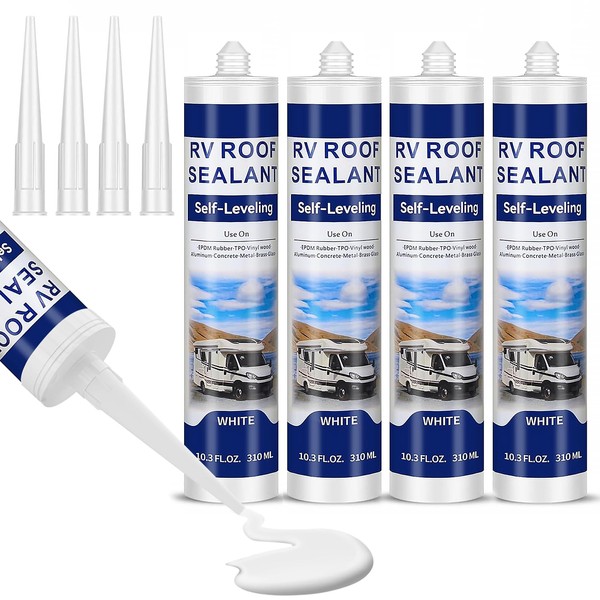 RV Roof Sealant 4 Pack, Self-Leveling Lap Sealant, White RV Caulking Sealant Tap Sealant for RV Roofing, Flexible, UV & Waterproof, Secure Odorless for RV Indoor Use