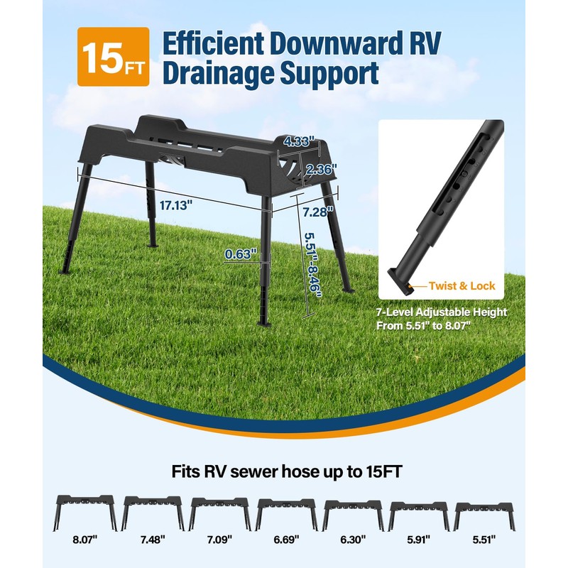 - 【7 Sections for 15FT Hose & Adjustable Height】With 7 configurable sections, the sewer hose support for RV camper fits for hoses with up to 15 feet length and 3 inch diameter. It is 7-level height adjustable from 5.51” to 8.05”, simply twist and lock the feet for a secure adjustment. Ensures efficient waste flow every time.