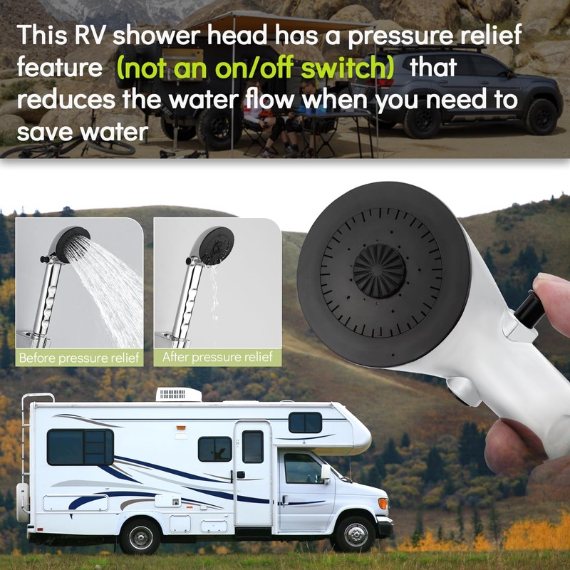 - WATER-SAVING DESIGN: Maximize efficiency with a travel trailer outdoor shower that features a water saving trickle valve switch (not an on/off switch). This travel trailer shower head conserves water flow when needed, making it an excellent RV replacement shower for your RV outside shower needs