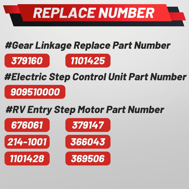- Fitment: This RV gear box linkage and step motor kit is compatible with Lippert Kwikee electric step series 22, 23, 28A, 30, 32, 33, 34, 35, 36, 38, and 40. Replaces part numbers 379160, 379147, 366043, 1101428, 676061, and 2141001.