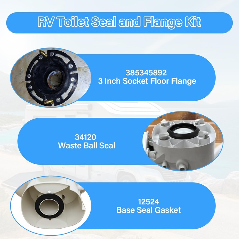- RV Toilet Seal Kit Includes: 385345892 RV Toilet 3 Inch Socket Floor Flange*1, 34120 Waste Ball Seal*1, 12524 Base Seal Gasket*1, Plastic Washers*4, 1 Set of Mounting Hardware. This kit can fulfill all your needs for RV camper toilet seals repair, say goodbye to the difficulty of choosing and matching.