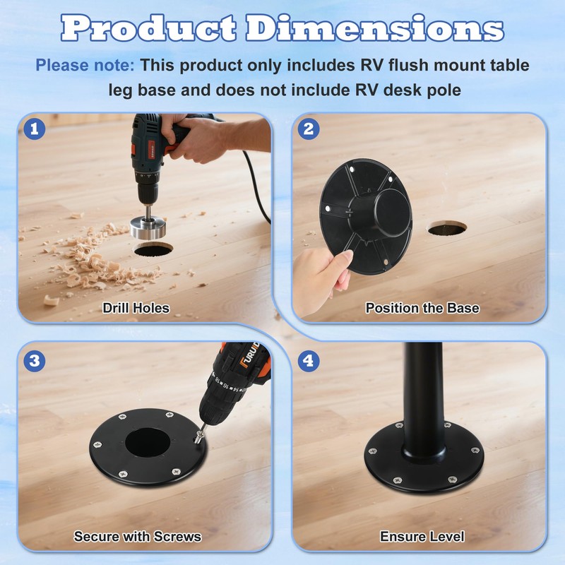 - Flush-Mount Design: The flush design seamlessly conceals installation traces. The base sits flush with your RV floor, maintaining a perfectly level surface to prevent tripping hazards and minimize collision risks-perfect for RV dinette tables